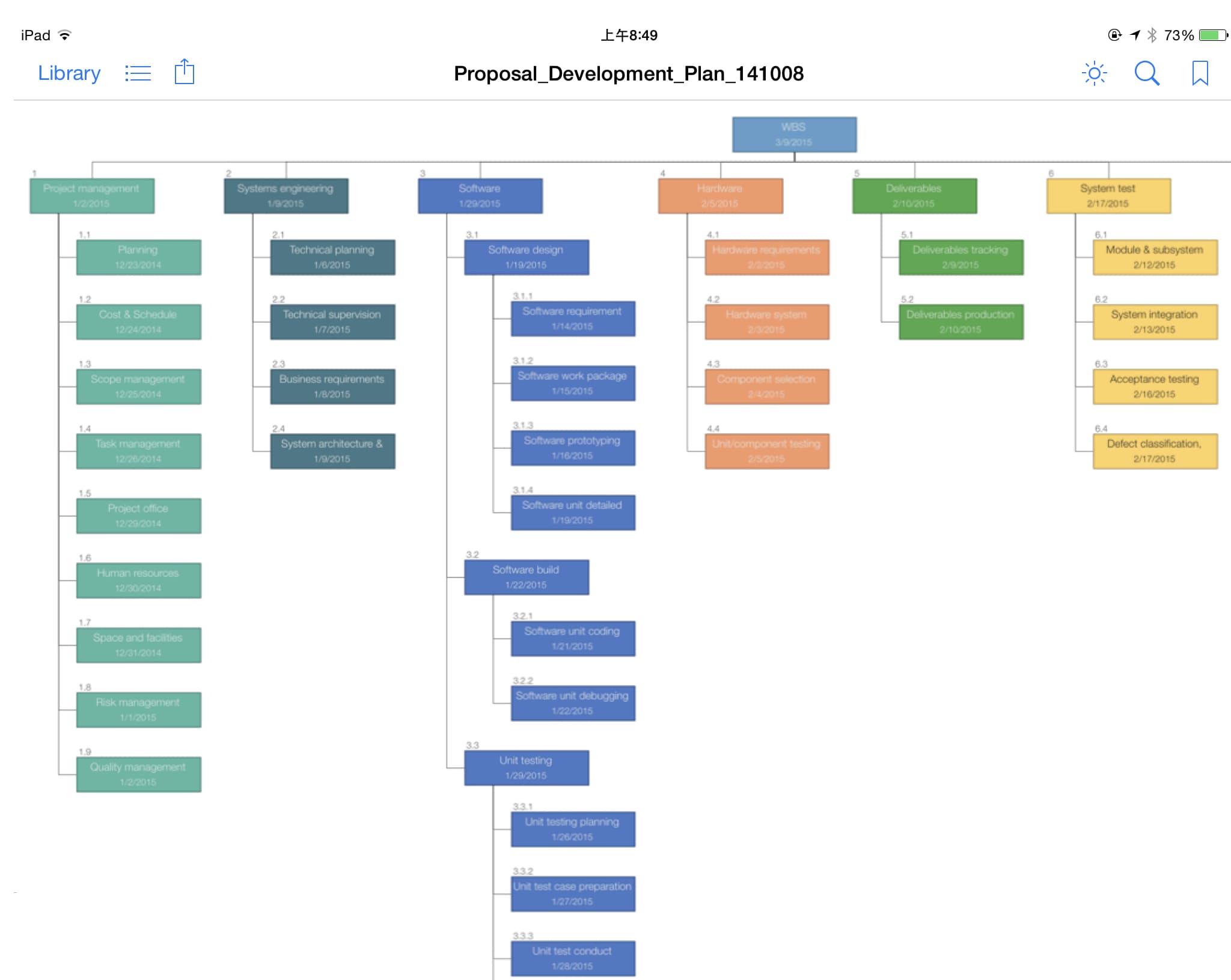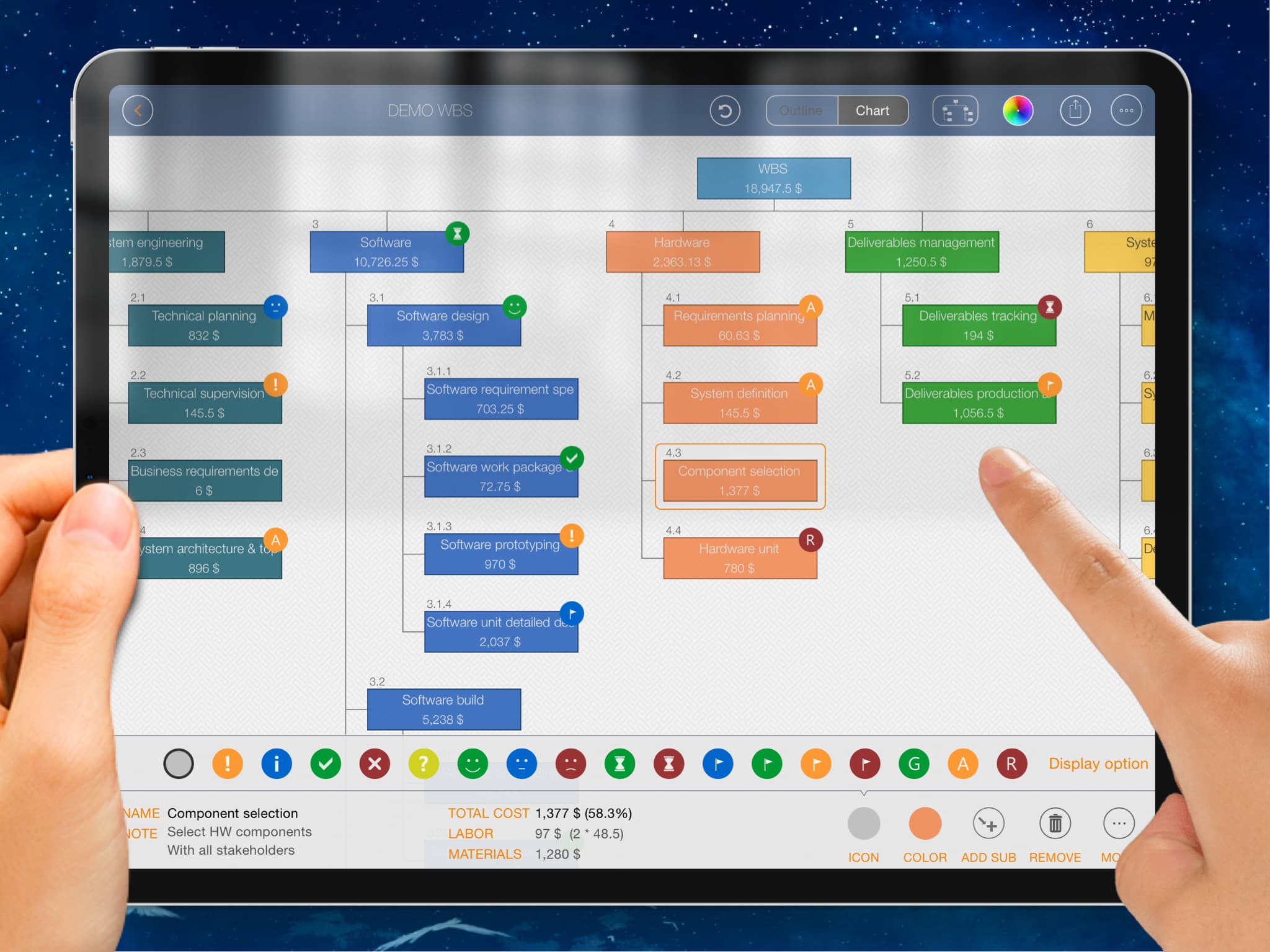 Maintain Work Breakdown Structure (WBS) in outline and chart views to organize work packages, set target dates, draft estimates, and track costs with intuitive gestures. WBS supports export to PDF, Excel, and image files, sync across multiple devices, and integration with QuickPlan to create a new project schedule.